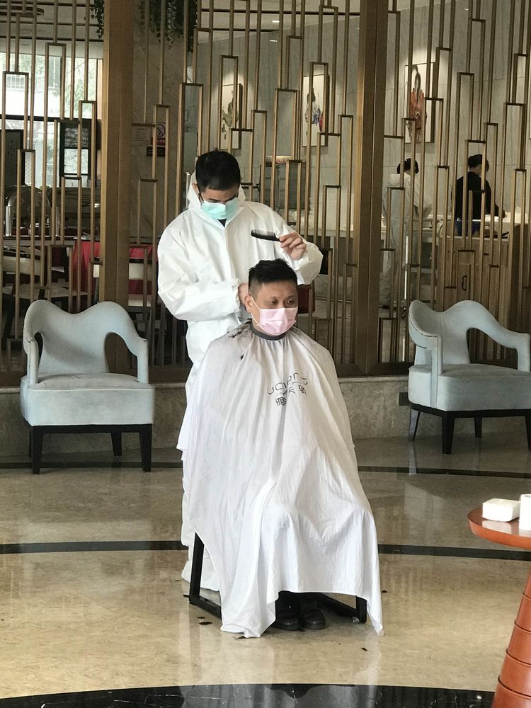 “麻煩幫我剪短點,再剪短點,兩個月沒理過發了,頭發從來沒這么長過!”3月8日上午10點,搬來幾張椅子、拿上幾把剪發器,“臨時理發店”在紐賓凱酒店大堂正式開業。