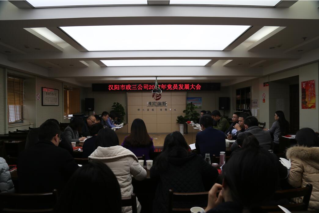 2017年12月23日,漢陽市政三公司支部全體黨員在公司大會議室召開黨員發展及轉正大會,大會同意郭文婷、劉海軍、閔慧子三名同志轉為中共正式黨員,接收向濤、紀成成兩名同志為中共預備黨員。大會由支部副書記郭一清主持。