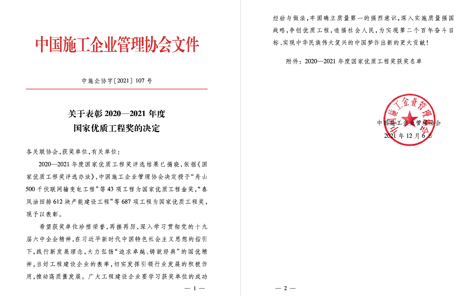 近日,該工程榮獲2020-2021年度第一批地區(qū)國家優(yōu)質工程獎,實現(xiàn)了博宏建設主申報國優(yōu)項目“0”的突破。