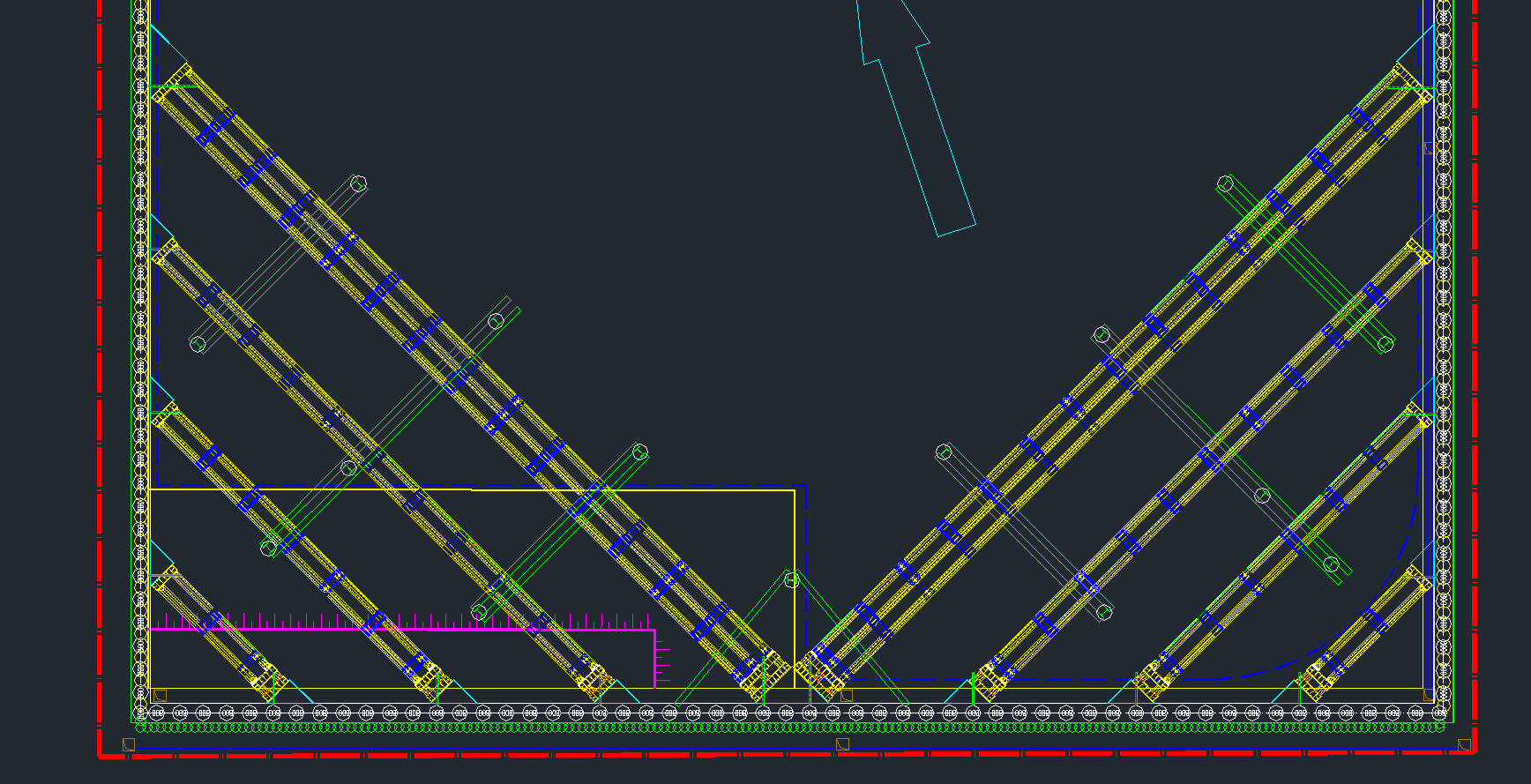 基坑南北兩側(cè)采用型鋼角撐,每一側(cè)角撐由四道型鋼斜撐組成,與冠梁形成45°角,由內(nèi)向外有雙拼型鋼和三拼型鋼兩種。型鋼采用HHC400ZC,長(zhǎng)度根據(jù)標(biāo)準(zhǔn)件長(zhǎng)度調(diào)整100A~12000A。跨度較大型鋼支撐設(shè)型鋼立柱,采用H488型鋼立柱。