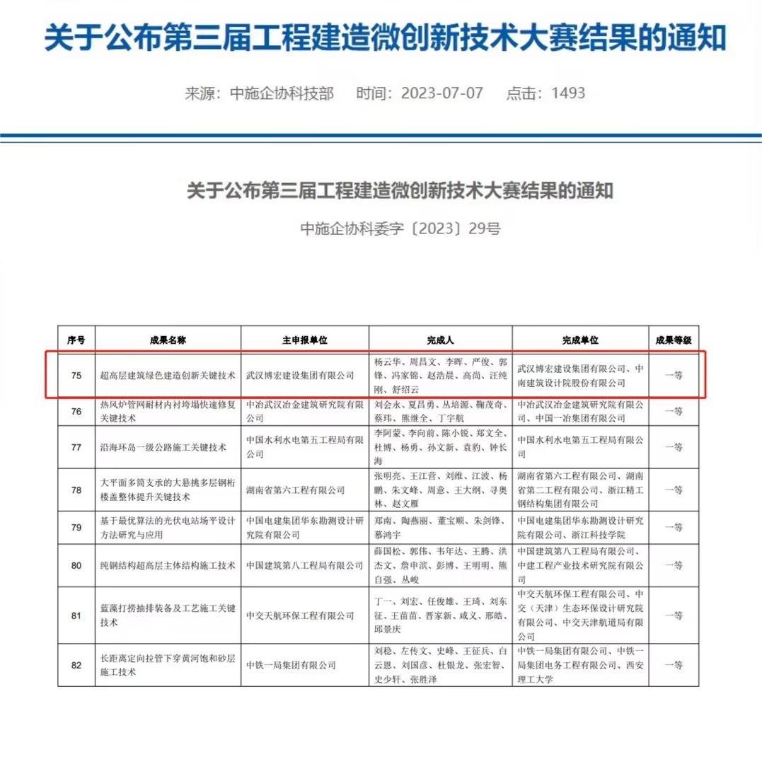 近日,中國施工企業管理協會公布第三屆工程建造微創新技術大賽獲獎結果。以中南科研設計中心建設項目為背景的“超高層建筑綠色建造創新關鍵技術”榮獲中施企協第三屆工程建造微創新技術大賽一等成果,這也是博宏建設集團首次獲得該類賽事一等獎。