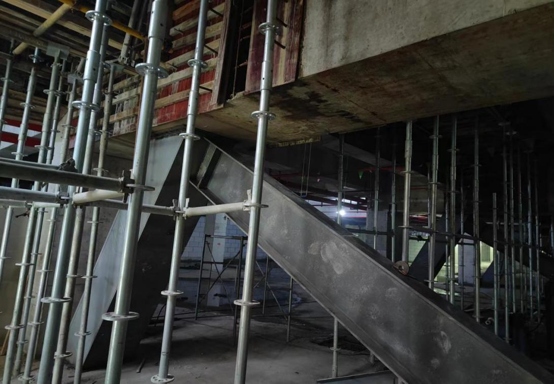 上述人字撐材料為項目副樓東側拆除懸挑鋼平臺的鋼構件進行回收利用。施工時支撐系統搭拆快捷,節省了人工、鋼管扣件及架體租賃費用,有效縮短了工期。該支撐系統具有整體剛度大、穩定性好、節點牢固的特點,無論是安裝、拆除都十分方便,靈活性較強,極大程度地保證了現場的施工安全。且待結構完成后,人字撐支撐材料可拆卸回收周轉利用,創造了良好的環保、經濟和社會效益。