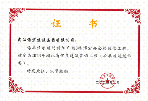 近日,湖北省建筑裝飾協會公布了2023年湖北省優良建筑裝飾工程名單,由博宏建設集團承建的新陽廣場G棟辦公樓裝修工程項目、漢陽區西部政務服務中心、國博D9等4所幼兒園整體改造項目(EPC) 獲評“2023年湖北省優良建筑裝飾工程(公共建筑裝飾類)”榮譽稱號。